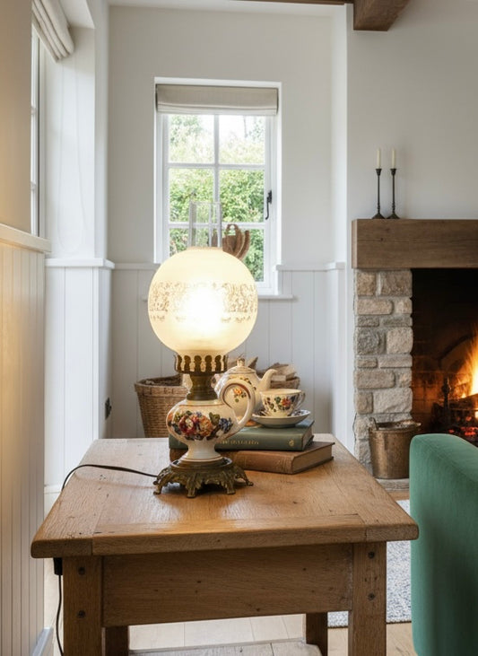Lampe ancienne laiton céramique façon lampe à pétrole
