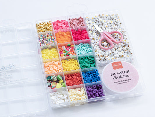Maxi boite 16 couleurs de perles heishi POP et accessoires + perles lettres, ciseaux et fil élastique