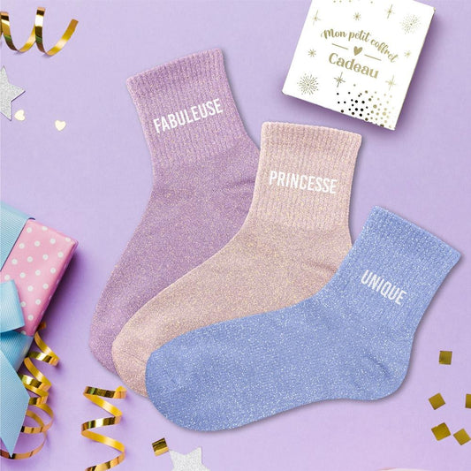 Coffret trio de chaussettes à paillettes "Fabuleuse, Princesse et Unique"