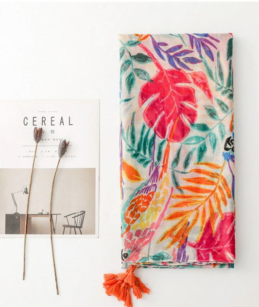 Grand foulard imprimé feuilles multicolore avec pompons