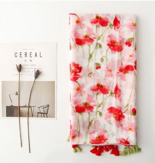 Grand foulard fleurs coquelicots avec pompons