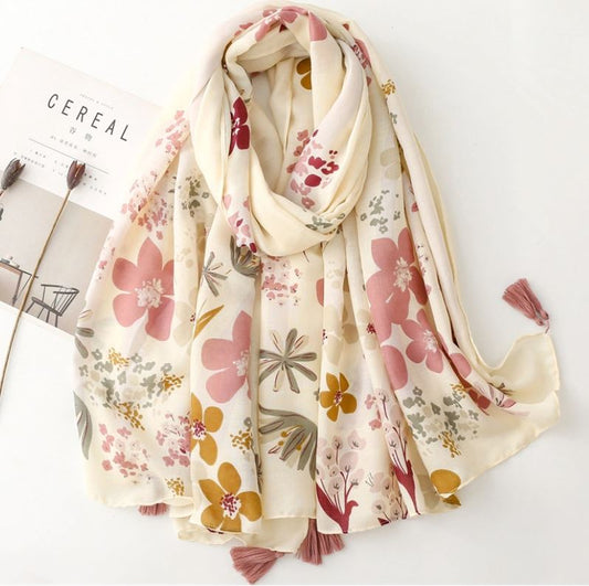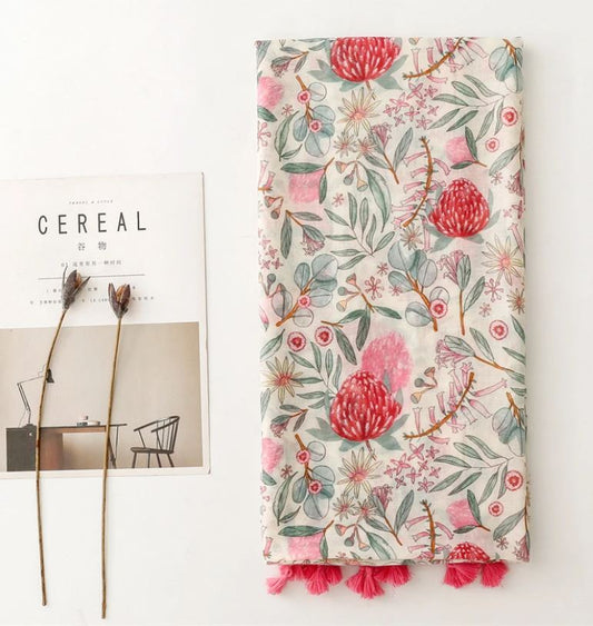 Grand Foulard imprimé fleurs avec pompons