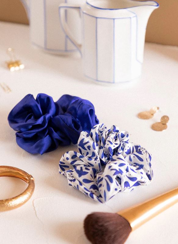 Avec leurs motifs gracieux d'hirondelles aux tons bleus apaisants, ce duo apporte une touche de charme à vos queues de cheval, chignons ou même comme accessoire tendance au poignet. Doux et résistant, il vous accompagnera toute la journée !