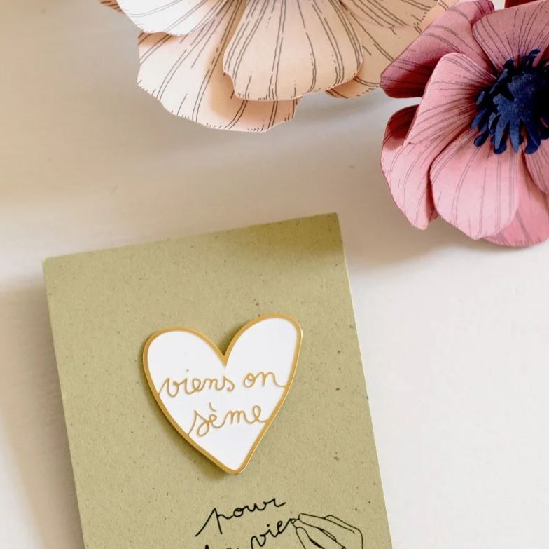 Ajoutez une touche de poésie à votre tenue avec notre adorable pin's en forme de cœur, gravé du message "Viens on sème". Ce petit bijou délicat incarne l'appel à la douceur et à la complicité, parfait pour semer de l'amour et de la positivité autour de vous. Fixez le sur votre veste, sac ou chemise, et laissez son charme discret parler pour vous. Un accessoire plein de sens, idéal pour un cadeau ou pour se faire plaisir.